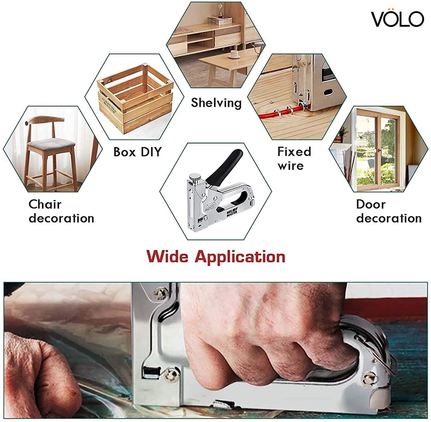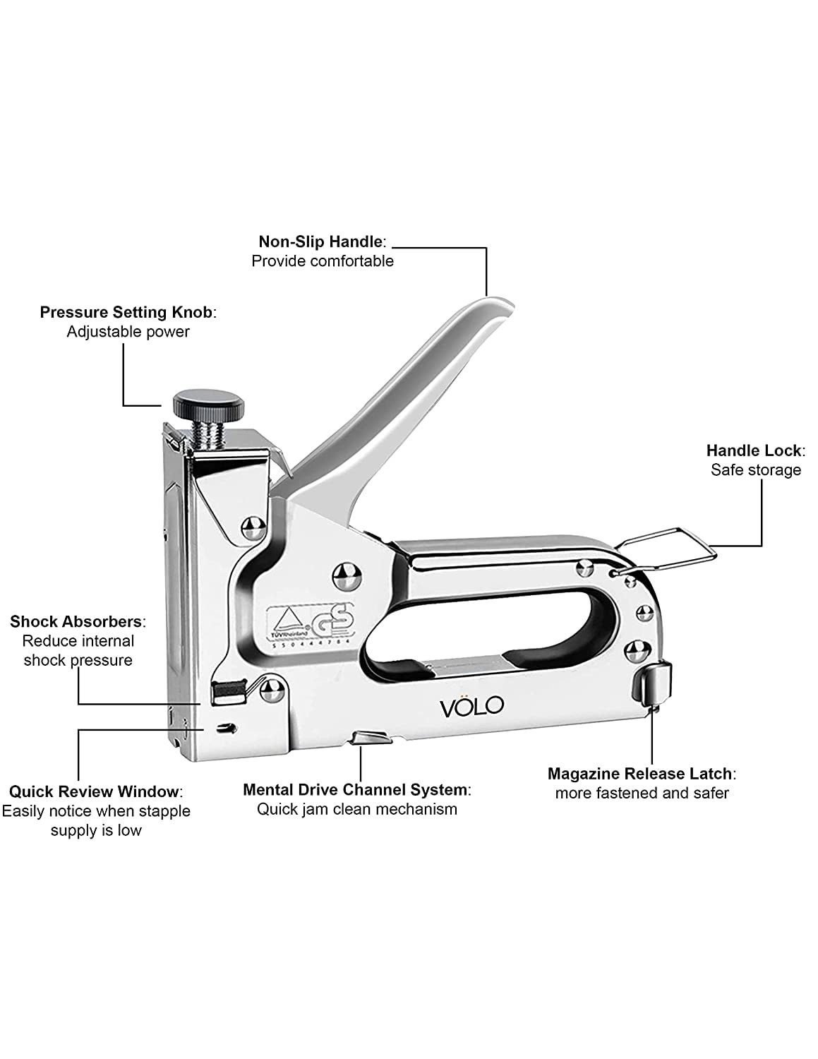 Crafted from high-strength chrome-plated steel, the Volo staple gun ensures maximum durability and rust resistance, even with heavy use. Its silver finish not only looks sleek but is also easy to clean and maintain.